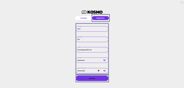 Um Kosmo nutzen zu können, benötigen Sie Ihre persönlichen Anmeldedaten. Sollten Sie noch keine Anmeldedaten haben, können Sie sich direkt in Webanwendung registrieren. Hierzu wechseln Sie auf dem Startbildschirm in das Register „Registrieren“. Füllen Sie alle Felder mit Ihren Angaben aus und legen Sie das gewünschte Passwort fest. Anschließend kann die Registrierung mit der Schaltfläche „Registrieren“ abgeschlossen werden.