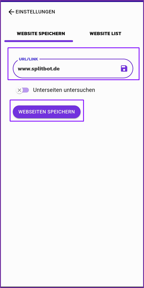Im Feld „URL/LINK“ kann eine neue Webseite eingetragen werden und durch Betätigung des Schiebereglers kann bestimmt werden, ob auch Unterseiten dieser konkreten Webseite berücksichtigt werden sollen.