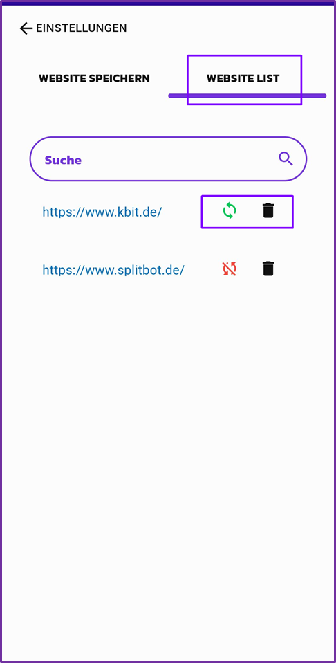 Mit dem Icon „Löschen“ kann die jeweilige Webseite endgültig aus dem Speicher gelöscht werden. Zusätzlich kann die Untersuchung der Unterseiten deaktiviert werden. Zudem kann in der Suchleiste gezielt nach gespeicherten Webseiten gesucht werden.