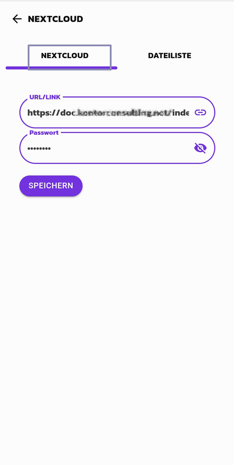 Im Register „Nextcloud“ kann nun der Nextcloud-Link zur gewünschten Datei eingegeben und das Nextcloud-Passwort erfasst werden. Mit der Schaltfläche „Speichern“ werden die Eingaben bestätigt.