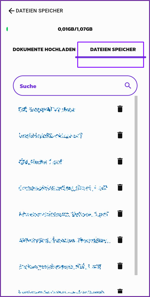 Alle hochgeladenen Dateien können über das Register „Dateien Speicher“ eingesehen werden. Hier steht außerdem eine Suchfunktion zur Verfügung. Mit dem entsprechenden Icon hinter der jeweiligen Datei, kann diese aus dem Speicher gelöscht werden.