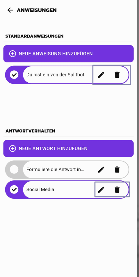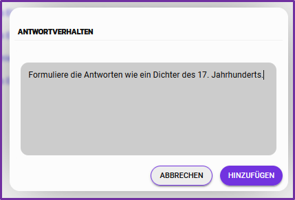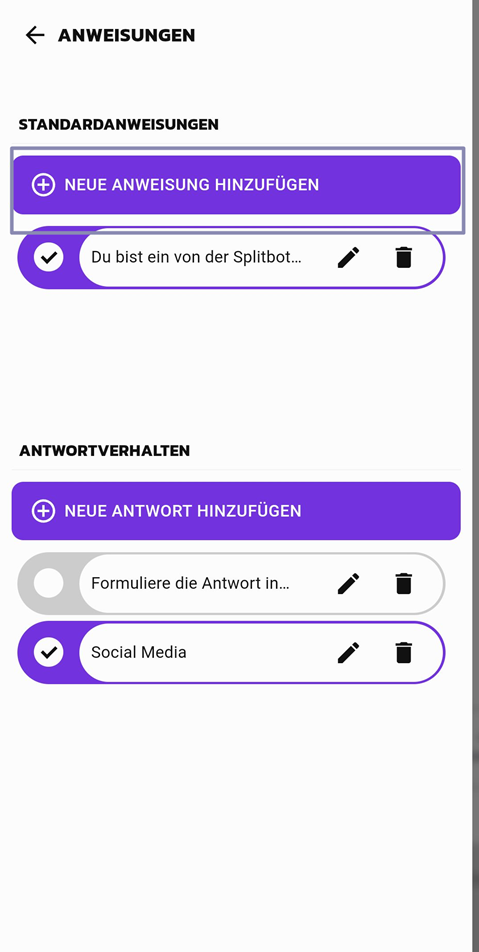 Mit Betätigung der Schaltflächen „Neue Anweisung hinzufügen“ beziehungsweise „Neue Antwort hinzufügen“ öffnet sich ein Freitextfeld zur Eingabe der jeweiligen Anweisung.
