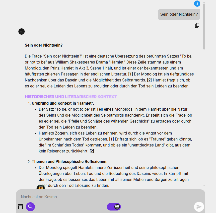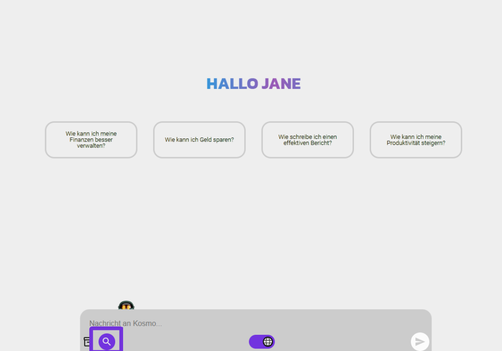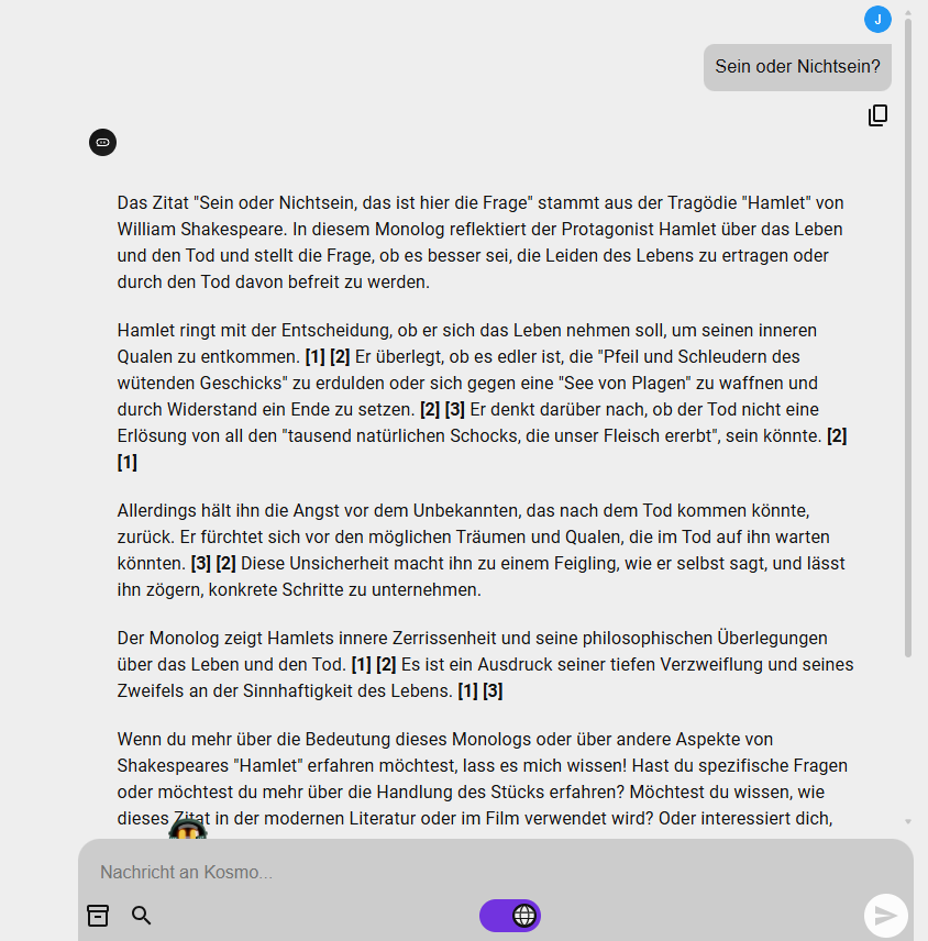 Im Eingabefeld kann über das entsprechende Icon der Investigationsmodus aktiviert werden. Ist der Investigationsmodus aktiviert, zerlegt KOSMO die ursprüngliche Anfrage in Unterfragen, beantwortet diese einzeln mit den verfügbaren Quellen und fasst sie anschließend zusammen. Hierdurch verbessert sich die Qualität der Antworten.