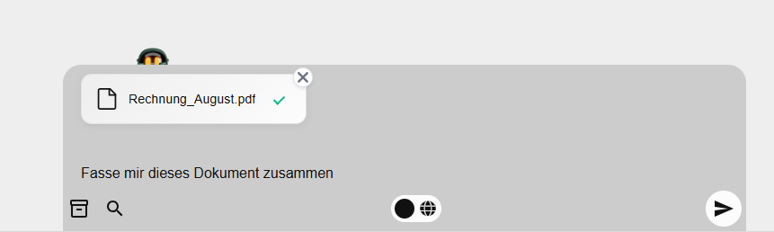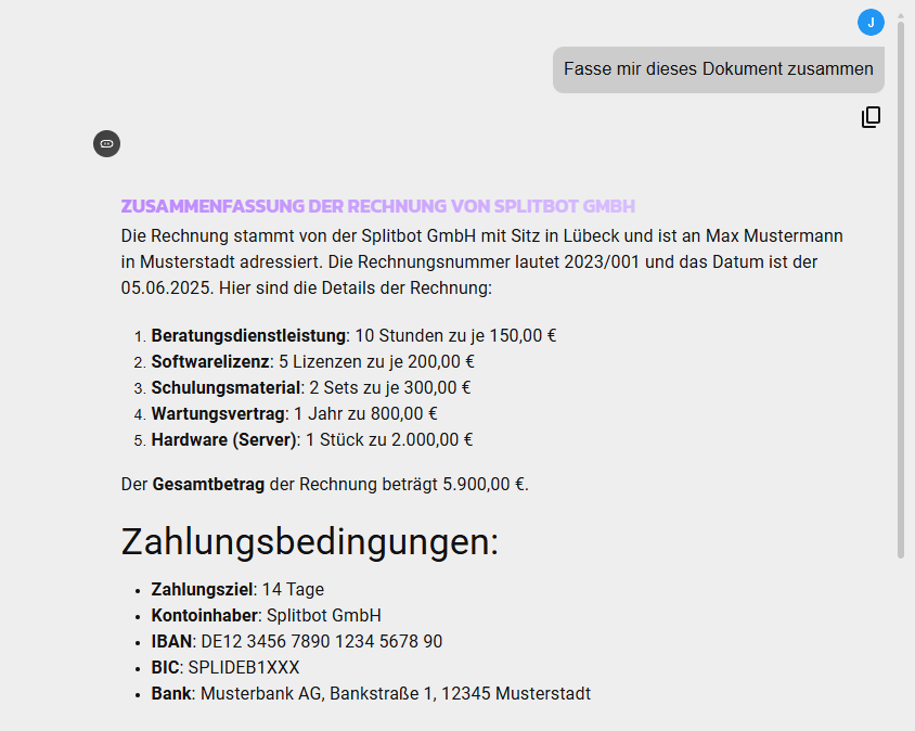 Sobald der Upload abgeschlossen ist, steht das gesamte Dokument als direkte Informationsquelle zur Verfügung. Es kann beispielsweise mit der Fragestellung „Fasse mir dieses Dokument zusammen“ direkt eine Zusammenfassung erstellt werden.