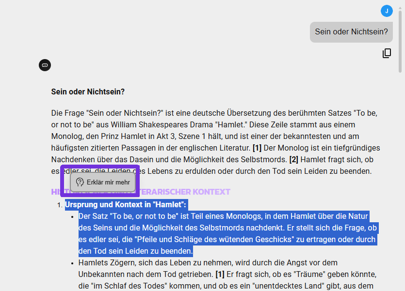 Um weitere Informationen zu einem bestimmten Stelle einer generierten Antwort zu erhalten, kann die Funktion „Erklär mir mehr“ genutzt werden. Hierzu wird die gewünschte Textpassage mit gedrückter Maustaste markiert. Oberhalb des markierten Textes erscheint dann die Schaltfläche „Erklär mir mehr“.
