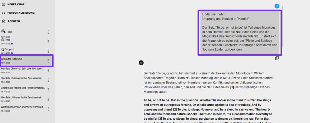 Wird die Schaltfläche betätigt, legt KOSMO eine neue Konversation an und erklärt die ausgewählte Passage ausführlich.