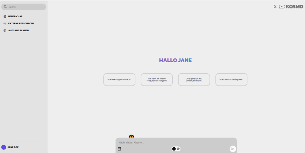 Nach erfolgreicher Anmeldung öffnet sich der Startbildschirm. Dies ist der Ausgangspunkt für alle Ihre Konversationen mit KOSMO.