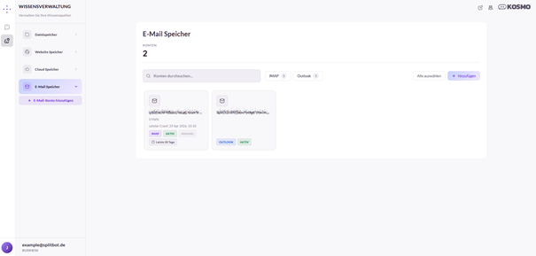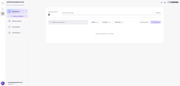 Im Bereich „Wissensverwaltung“ können alle zusätzlichen Informationsquellen verwaltet werden. Das Menü bietet die Funktionen „Dateispeicher“, „Website Speicher“, „Cloud Speicher“ und „E-Mail-Konten“.