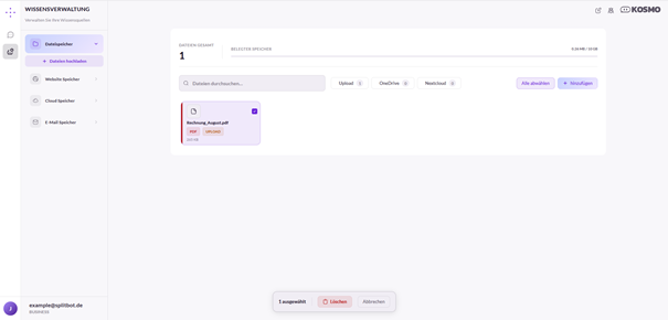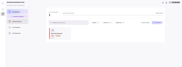 Darunter werden alle Dateien angezeigt, die KOSMO als Informationsquelle zur Verfügung stehen. Mit den Schaltflächen „Upload“ „OneDrive“ und „Nextcloud“ kann die Anzeige auf die jeweilige Dateiherkunft eingeschränkt werden. Zusätzlich steht eine Suchfunktion für die gezielte Suche nach Dateinamen zur Verfügung.