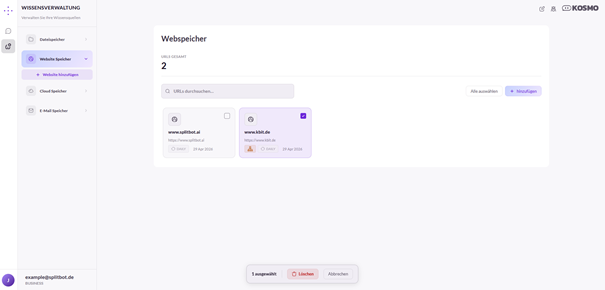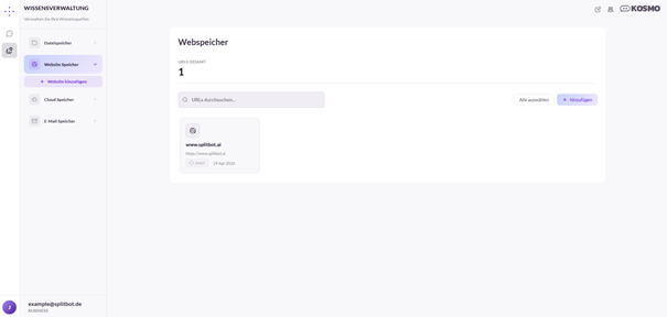 Der Website Speicher bietet die Möglichkeit, bestimmte Webseiten als Informationsquelle zu nutzen. Im oberen Bereich wird die Anzahl bereits gespeicherter URLs angezeigt. Zusätzlich steht eine Suchfunktion zur Verfügung.