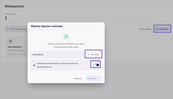 Mit der Schaltfläche „Website hinzufügen“ in der Navigationsleiste oder der Schaltfläche „hinzufügen“ kann eine neue Website hinzugefügt werden. Es öffnet sich ein Dialogfenster, in dem die gewünschte URL eingetragen werden kann. Zusätzlich kann anhand des Schiebereglers bestimmt werden, ob Subdomains, also Unterseiten, in das Crawling einbezogen werden sollen.