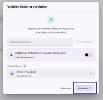 Mit der Schaltfläche „Verbinden“ wird die Website dem Website Speicher hinzugefügt und als zusätzliche Informationsquelle genutzt.