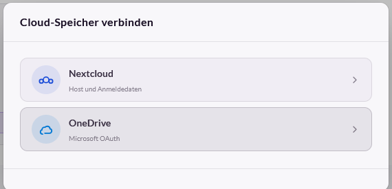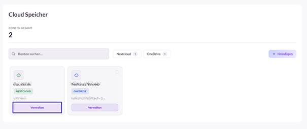 Im Bereich „Cloud Speicher“ können Nextcloud oder OneDrive Konten direkt verbunden werden. Im oberen Bereich wird die Gesamtzahl der bereits verbundenen Konten angezeigt. Darunter befindet sich die Suchfunktion, sowie die Anzeige der einzelnen, bereits verbundenen Konten. Mit den Schaltflächen „Nextcloud“ und „OneDrive“ kann die Anzeige auf die jeweiligen Konten beschränkt werden.