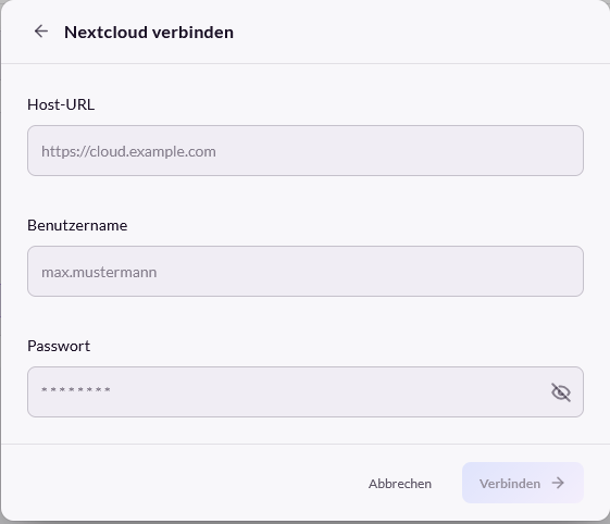 Anschließend öffnet sich bei Nextcloud-Konten ein Dialogfenster zur Eingabe der Host-URL, sowie des Benutzernamens und des Passwortes.