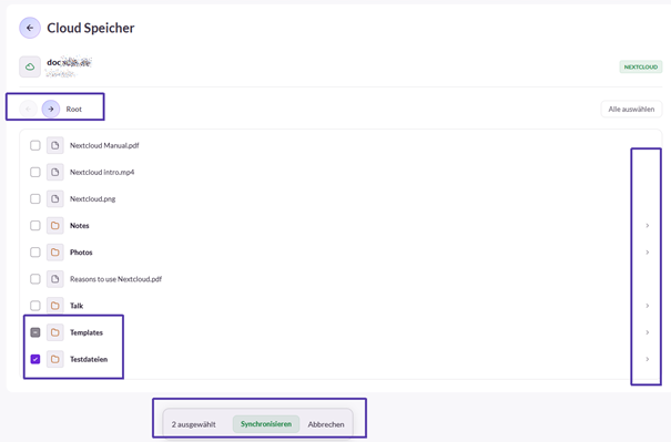 Wurde mindestens eine Datei markiert oder die Funktion „Alle auswählen“ genutzt, wird im unteren Bildschirmbereich die Schaltfläche „Synchronisieren“ angezeigt. Wird diese betätigt, wird die Datei ab sofort synchronisiert und steht als zusätzliche Informationsquelle zur Verfügung.