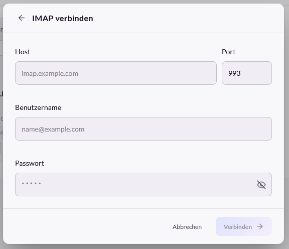 Im Bereich E-Mail-Konten wird im oberen Bereich die Anzahl der bisher verbundenen Konten angezeigt. Zusätzlich steht eine Suchfunktion zur Verfügung. Mit Hilfe der Schaltflächen „IMAP“ oder „Outlook“ kann die Anzeige der Konten auf die jeweilige Art eingeschränkt werden.