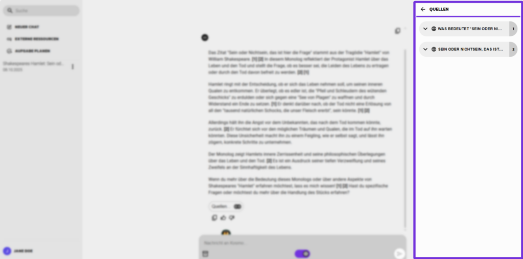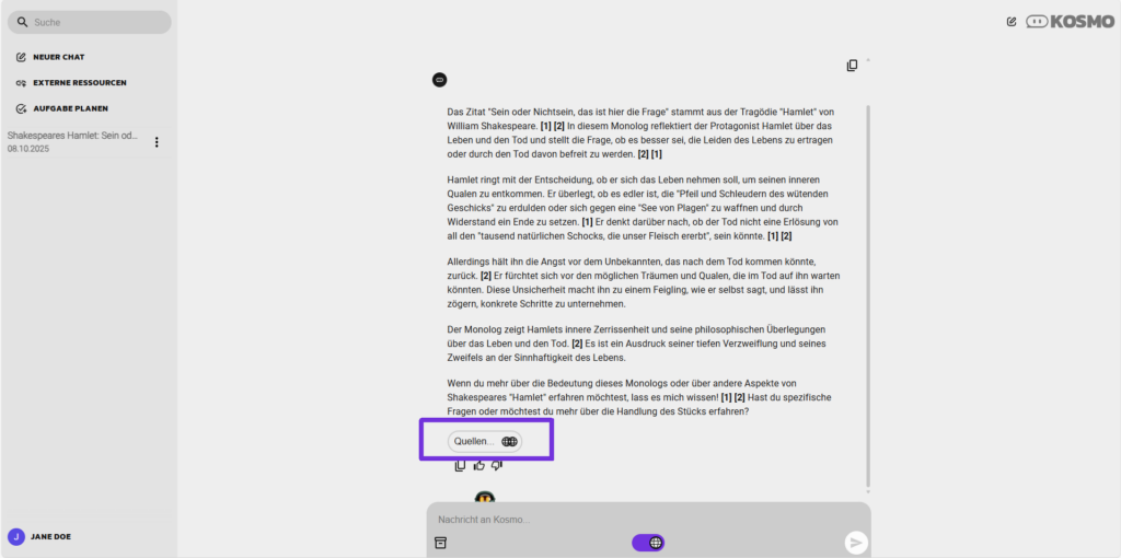 Unterhalb der jeweiligen Antwort wird, sofern Quellen zur Beantwortung genutzt wurden, die Schaltfläche „Quellen“ angezeigt.